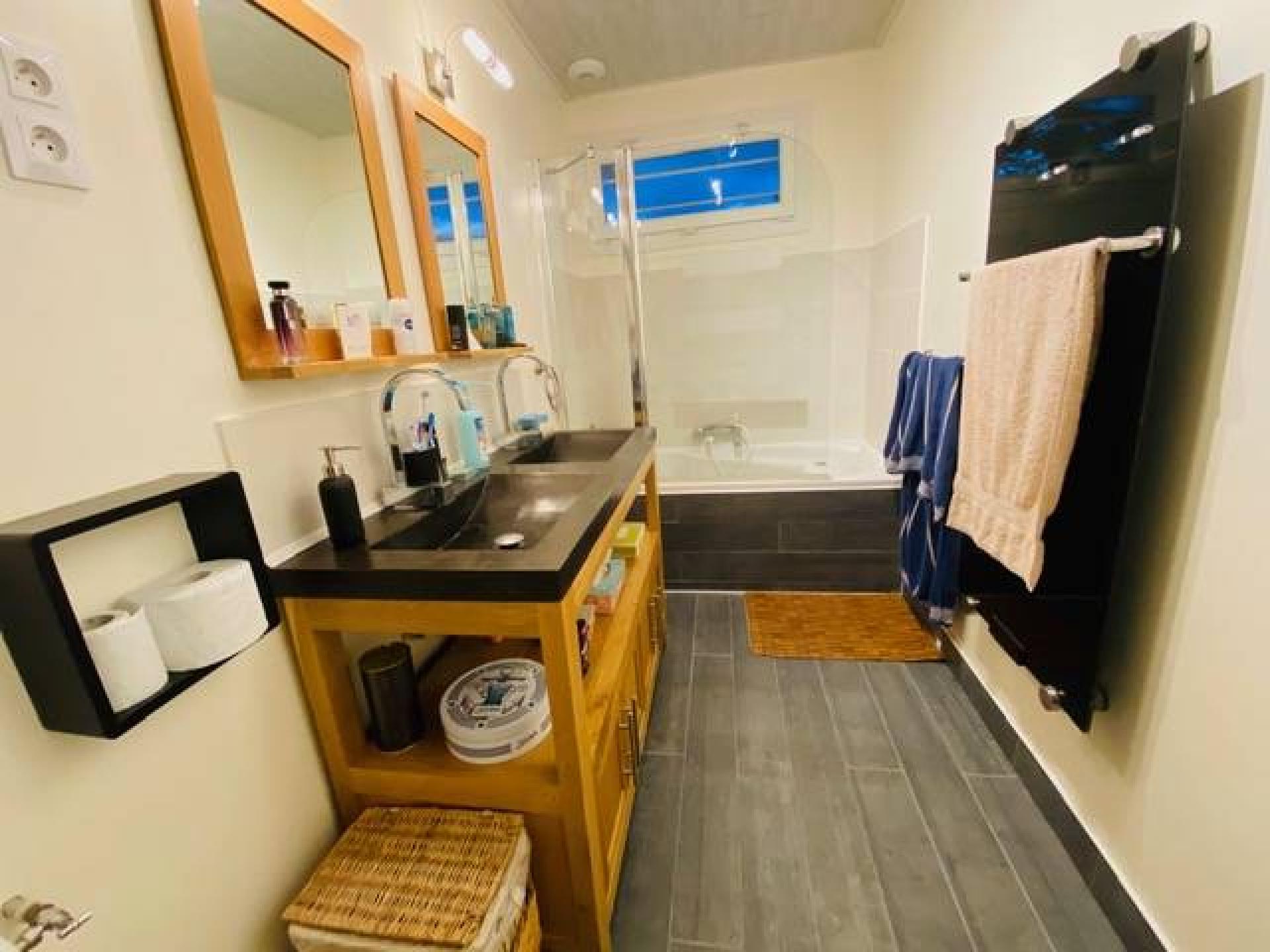 Une salle de bains avec baignoire et double vasque,