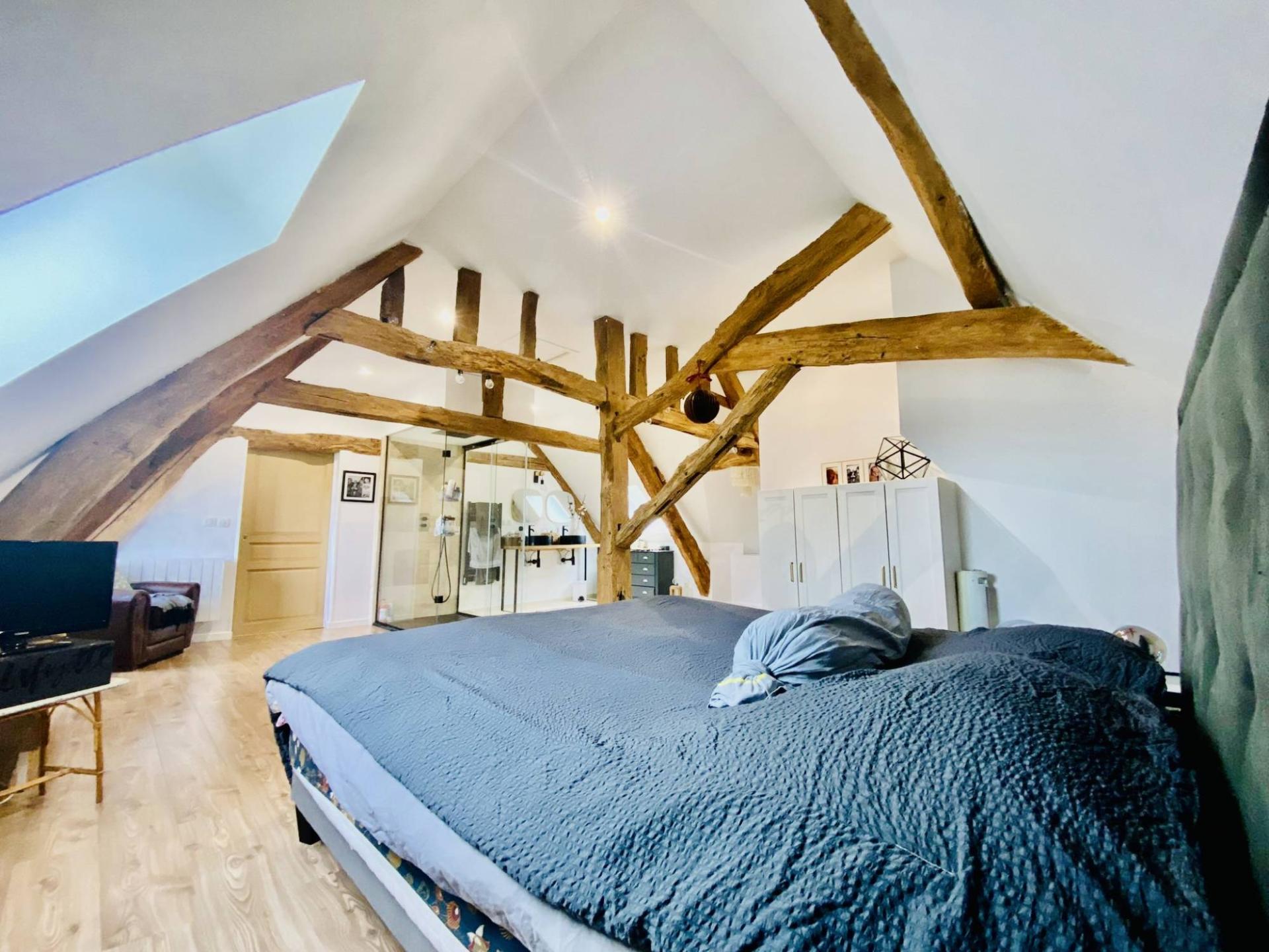 A l'étage, 3 belles chambres donc 2 suites parentale. L'une de ces suites très spacieuses environ 52 m² avec sa propre salle de bain avec doubles vasques, douche à l'italienne, dressing. Très chaleureuses avec chacune leur vue imprenable sur la Seine.