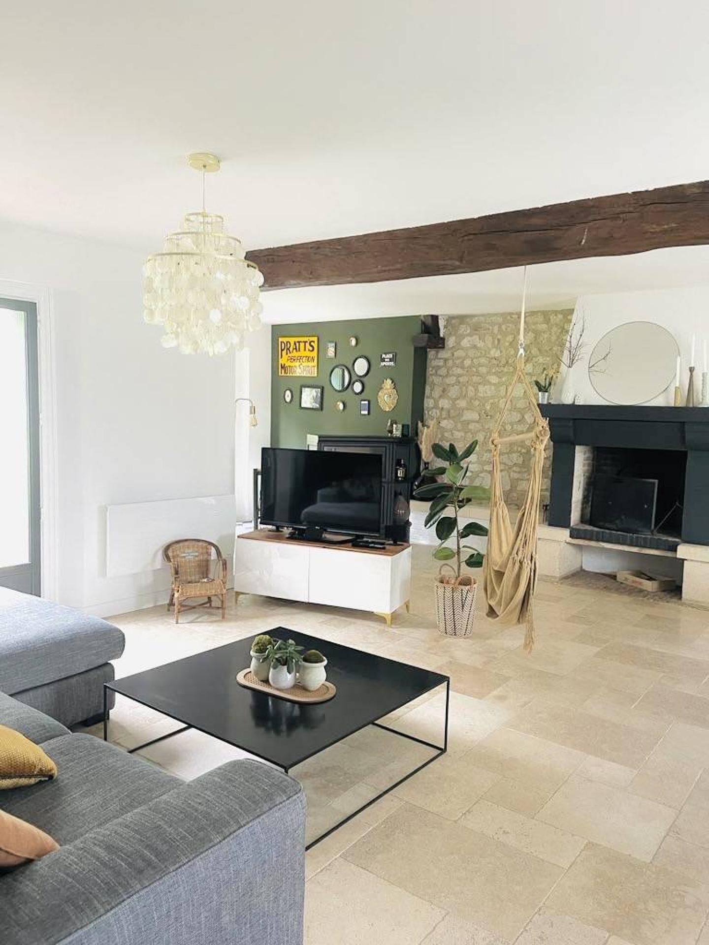 Au Rez de chaussée, vous entrez dans un grand Salon/Séjour de plus de 50 m² avec sa cheminée ouverte d'époque. Une cuisine moderne et lumineuse avec ses notes de caractère ainsi qu'un bureau, une salle de bain, un WC et une chambre donnant sur la terrasse.