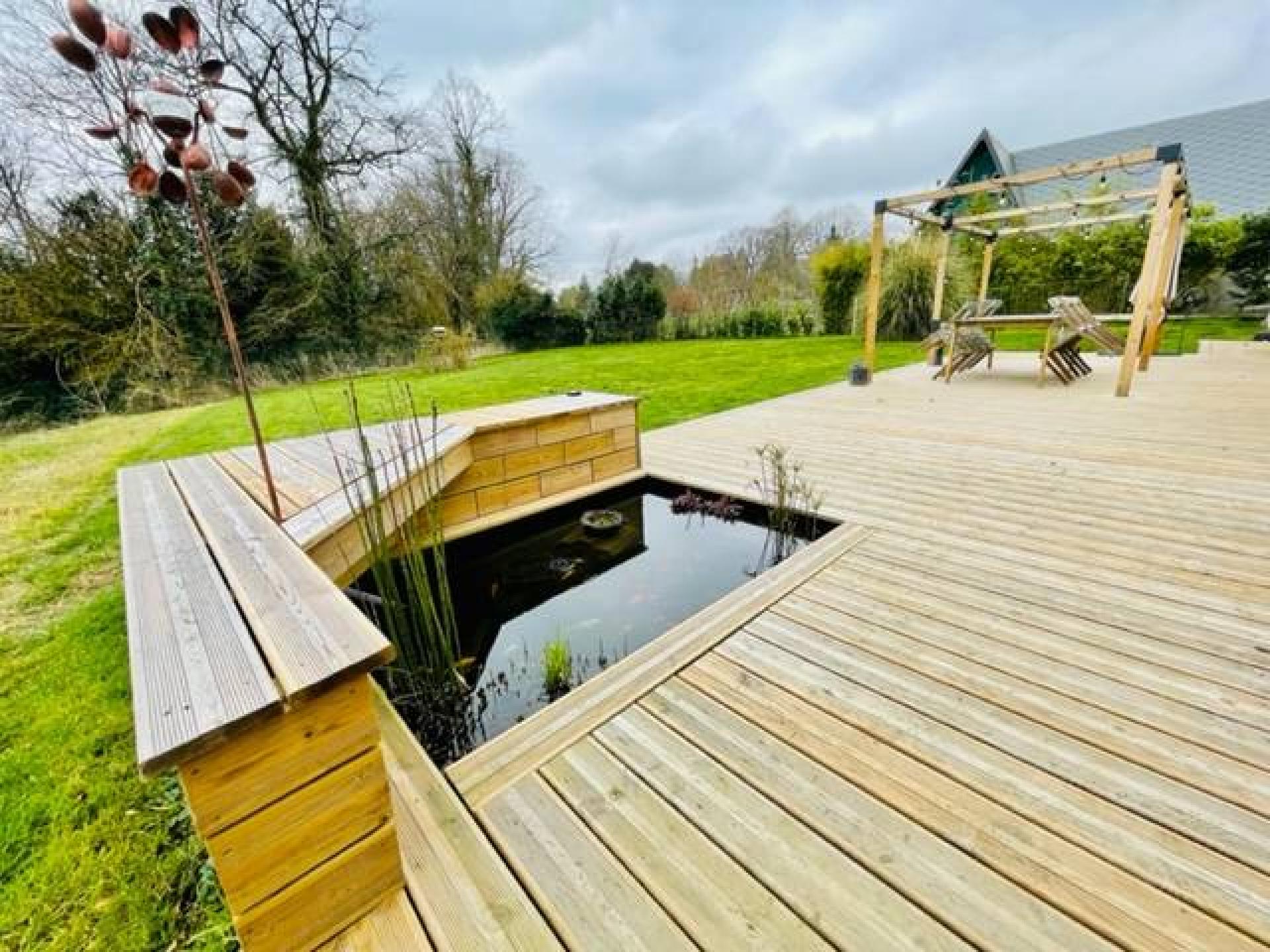 un magnifique jardin comprenant une terrasse de 65 m² avec bassin et pergola